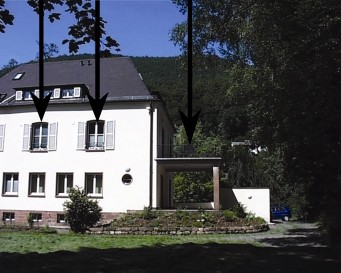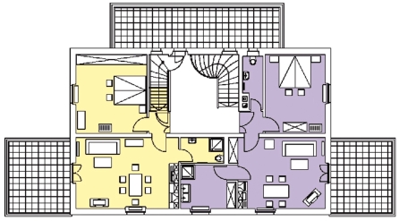 To watch photos of the individual areas of the flat, please click on the lilac-coloured rooms on the plan below: